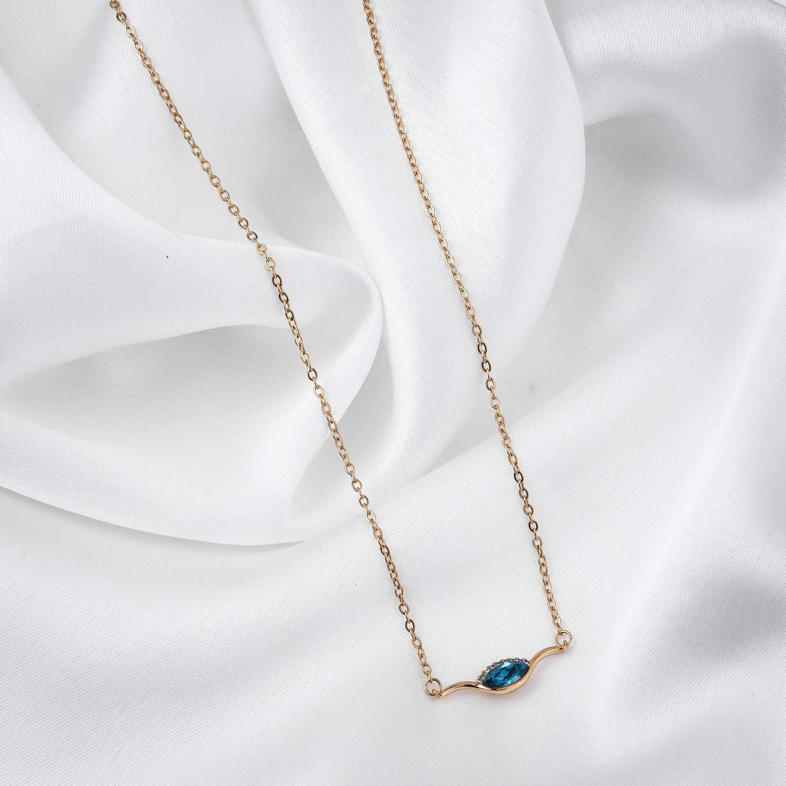 This minimal blue oval stone chain pendant features a sleek and balanced design with a central oval blue stone set in a polished imitation frame. The slim chain enhances its clean and modern appearance.