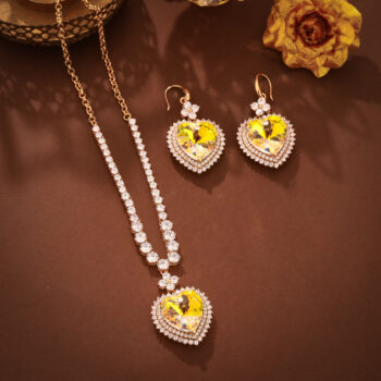 Premium yellow heart pendant and earring set featuring layered crystal detailing and a refined imitation finish. Elegant and coordinated design.